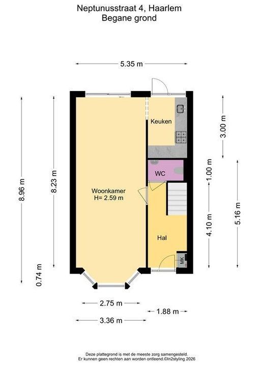 Begane grond: entree, hal, toilet met fonteintje, lichte woonkamer met schuifpui naar de achtertuin, open keuken met deur naar de tuin.
