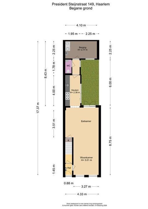Begane grond: hal, lichte woonkamer met openslaande deuren naar de besloten tuin, semi-open keuken. WC. Ruime berging/bijkeuken met aansluitingen voor wasmachine en -droger.